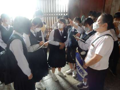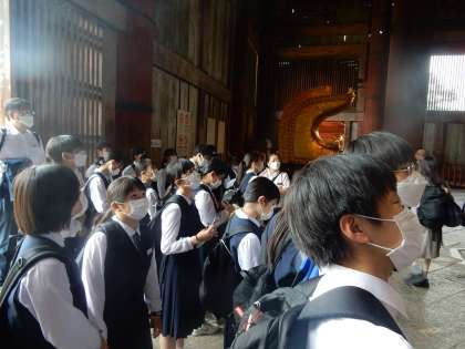 修学旅行 3A 東大寺(その2) 公開日 2022/05/19 更新日 2022/05/19 3年生 何度も見上げました。 また、ガイドさんの話を真剣に聞いてメモする姿も見られました。事後学習に生かそうとしています。