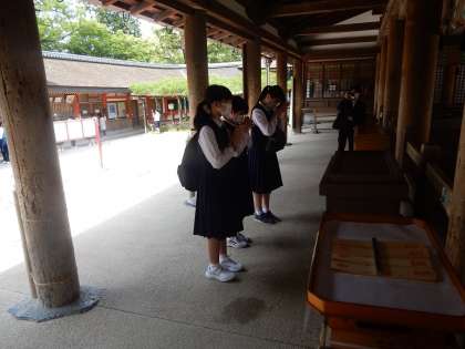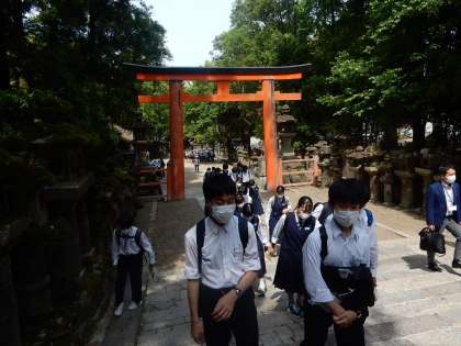 修学旅行 春日大社(A組) 公開日 2022/05/19 更新日 2022/05/19 3年生 興福寺の後には、春日大社に参拝しました。奈良公園を通り過ぎ、鹿や周りの木々を眺めながら、春日大社へと向かいました。