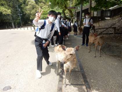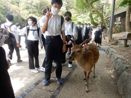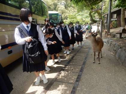修学旅行 鹿とのふれあい(その2) 公開日 2022/05/19 更新日 2022/05/19 3年生 京都に向かうバスに乗車するとき、まるで鹿に見送られているようでした。今日もたくさん歩いて疲労がたまったようですが、良いひとときとなりました。