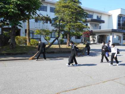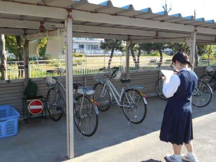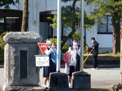 生徒会活動です。 上:国旗・校旗の掲揚 中:前庭清掃 下:自転車カギかけチェック