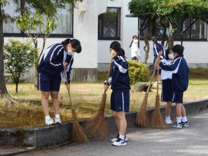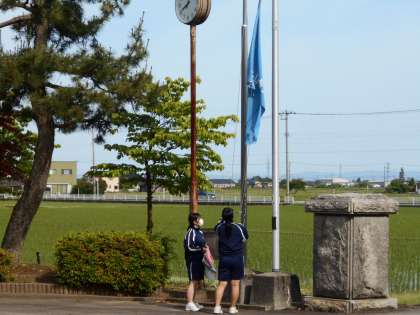 生徒会活動です。 上・中:VAS活動です。 下:国旗・校旗の掲揚です。