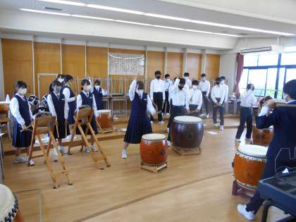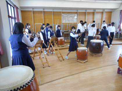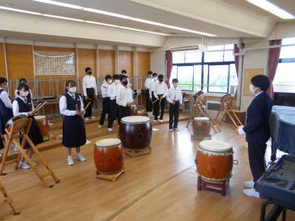 音楽です。 ばちの持ち方、姿勢、たたき方等、学習しました。