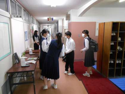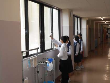 朝の様子2 公開日 2022/06/15 更新日 2022/06/15 学校生活 VAS活動を行いました。 雨天のため、校舎内で窓ふきを行いました。 上:登校してきた生徒に窓ふき用の新聞紙を配付しています。 下:1階廊下の窓ふきをしています。
