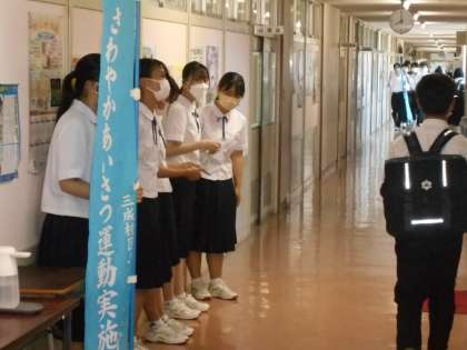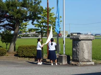 生徒会活動です。 さわやかあいさつ運動と国旗・校旗の掲揚です。