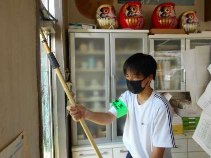 常願寺美装での活動の様子です。 大きな窓を一生懸命綺麗にしています。