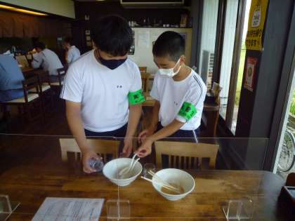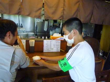 「らーめん楓の花」での活動の様子です。 緊張しながらも接客に取り組んでいます。
