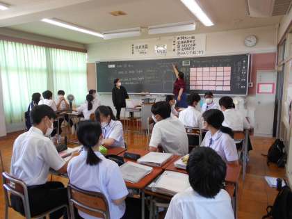 写真上:3A(英語)ALTのルエラ先生の指示を聞いています。