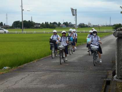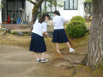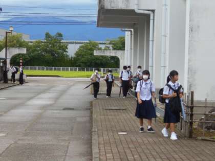 上・中:登校の様子です。 下:前庭清掃の様子です。