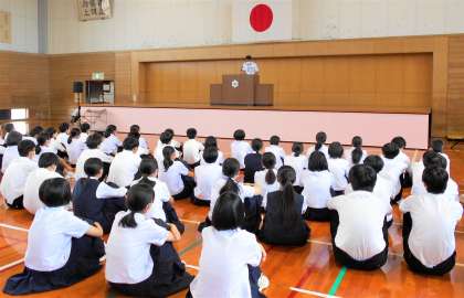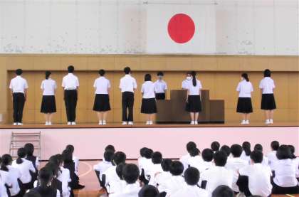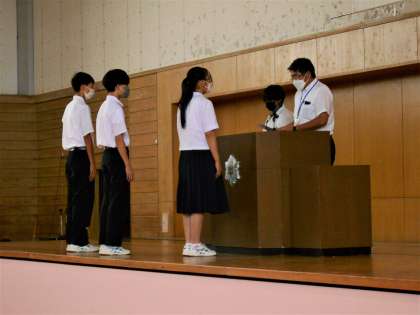 新生徒会会長、副会長に校長先生から任命証が授与され、生徒会長から生徒会の運営委員、専門委員長に委嘱状が授与されました。