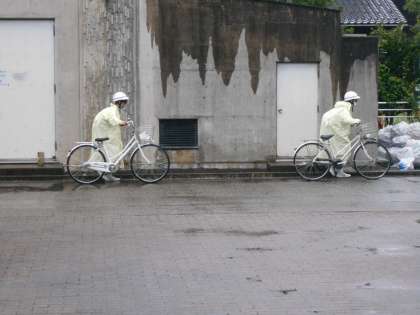 登校の様子です。 雨のため、雨具を着て自転車通学です。