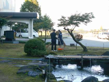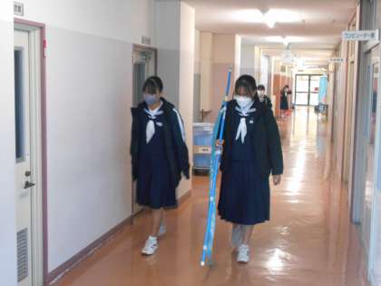 上・中:さわやかあいさつ運動の様子です。 下:前庭清掃の様子です。