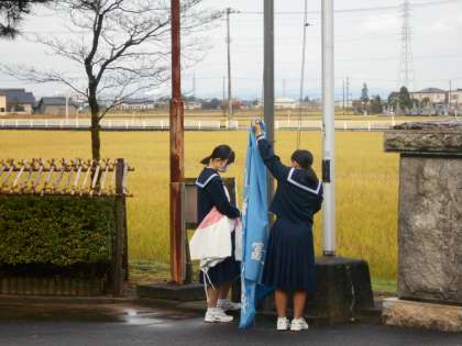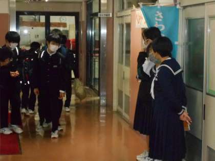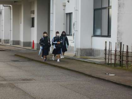 上:登校の様子 中:さわやかあいさつ運動の様子 下:国旗・校旗の掲揚の様子