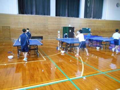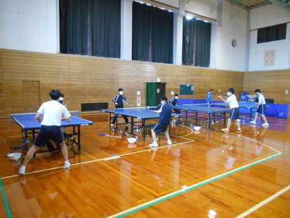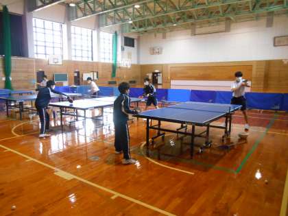 卓球部の活動の様子です。 半袖、短パン、寒い体育館ですが気合い入ってます。 顧問も一緒に活動しています。