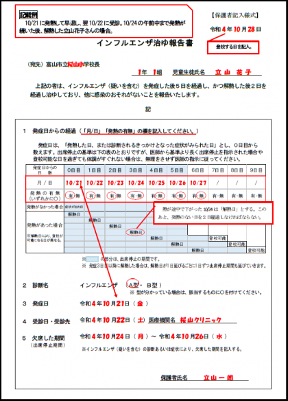 ※ インフルエンザに罹患された場合、回復後、登校する際は「インフルエンザ治ゆ報告書」の提出(保護者の方が記入)が必要です。