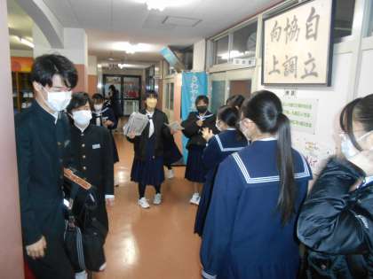 水曜日はVAS活動の日です。 本日の活動は、窓ふきです。環境委員の生徒が、参加者に新聞紙を配付しています。