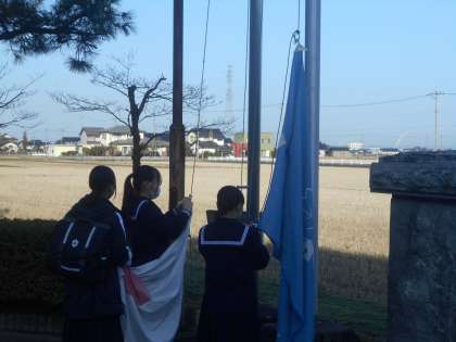 上:国旗・校旗の掲揚の様子です。 中:1A 下:2A