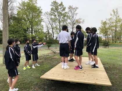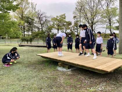 1年生 プロジェクトアドベンチャー(その2) 公開日 2023/04/14 更新日 2023/04/14 1年生 シーソーが地面に着かないようにバランスをとりながら乗っていく活動を行いました。心を合わせることが大切です。 2グループに分かれて行いました。こちら4・5・6班の様子です。果たして全員乗ることができたのでしょうか?!