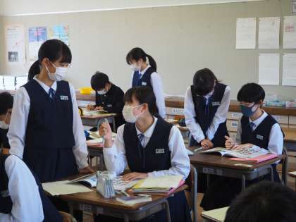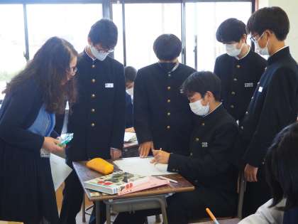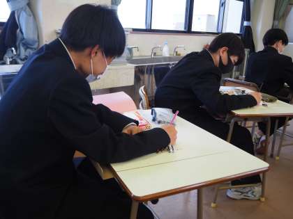 美術の様子です。自分の描いたスケッチを、先生や友達に見せて見所を紹介していました。「先生、俺の作品はね、、、!」