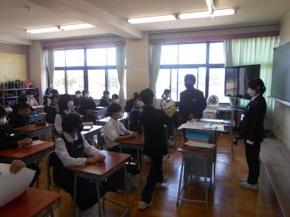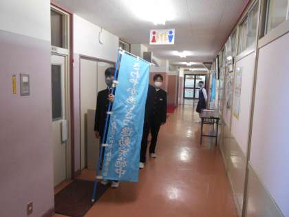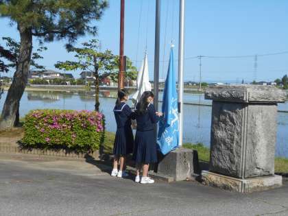 上:さわやかあいさつ運動の様子です。 中:国旗・校旗の掲揚の様子です。 朝の教室の様子です。 下:1A