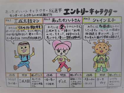 保体委 あったかキャラクター総選挙(その2) 公開日 2023/05/15 更新日 2023/05/15 生徒会・専門委員会 とても素敵なキャラクターが3人生まれたので1つに絞るのは勿体ないと考え、投票では、3人組のセンターとなるメインキャラクターを決めることにしました。役割分担をして準備を進め、学級でお知らせしました。