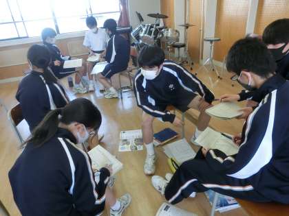 音楽の様子です。「面白いリズムアンサンブルにするための工夫をしよう」という課題をグループで取り組んでいます。