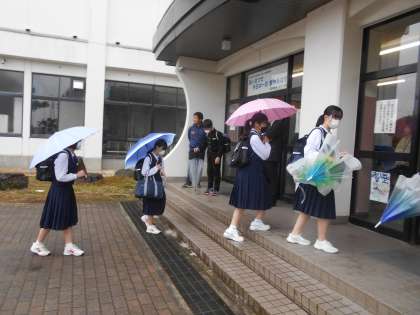 上・中:登校の様子です。小雨が降る中での登校でした。 下:さわやかあいさつ運動の様子です。