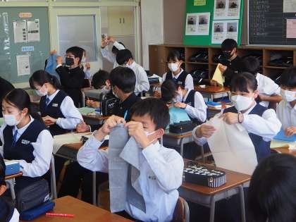 家庭科の学習の様子です。ティッシュボックスの制作に取りかかりました。