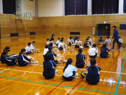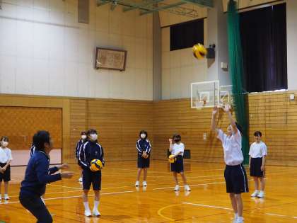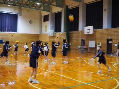 体育の学習の様子です。バレーボールのオーバーパスやアンダーパスの練習を行っていました。