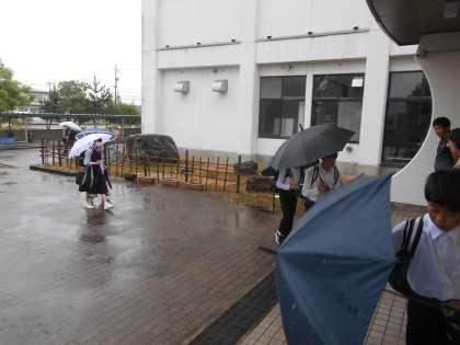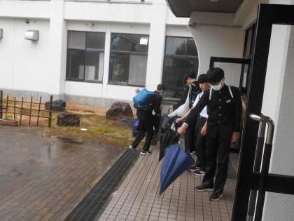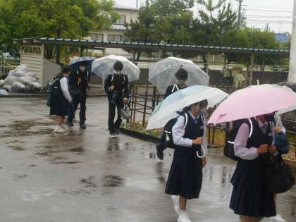 登校の様子です。 降雨の中、雨具を利用しての登校です。