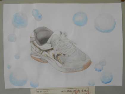 鉛筆で、思い思いの角度からシューズをとらえ丁寧に彩色していました。