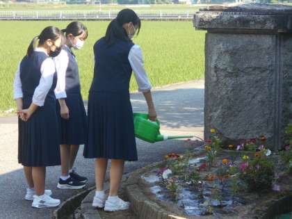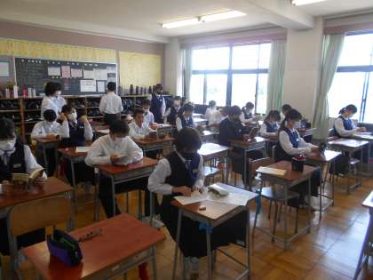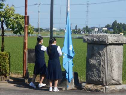 上:環境委員会の活動の様子です。 中:国旗・校旗の掲揚の様子です。 下:朝の教室1Aです。