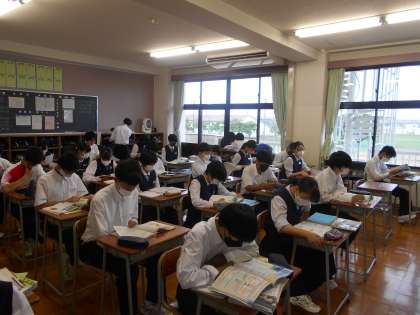 上:降雨の中の登校です。 中:1Aの朝の様子です。 下:2Aの朝の様子です。