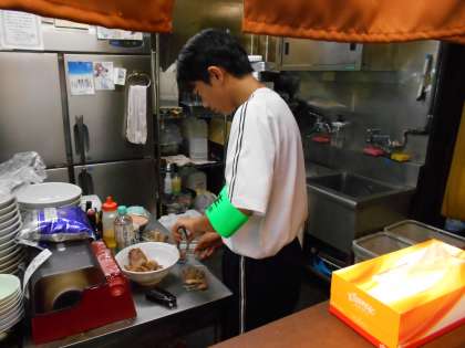 2学年「14歳の挑戦」2日目 らーめん楓の花 公開日 2023/07/04 更新日 2023/07/04 2年生 調理補助を行いながら、お客様が来店すると、素早く水を出したり、注文を聞いたりしていました。