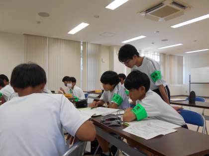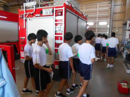 2学年「14歳の挑戦」2日目 水橋消防署 公開日 2023/07/04 更新日 2023/07/04 2年生 今日は「立ち入り検査」や「火災事例」の説明を聞きました。その後、署内査察をしました。ホワイトボードに聞かれたことをまとめ、発表もしました。
