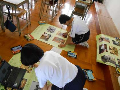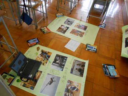 学校では、各事業所での活動写真を使って掲示物をつくっています。完成したら掲示するので見てくださいね。
