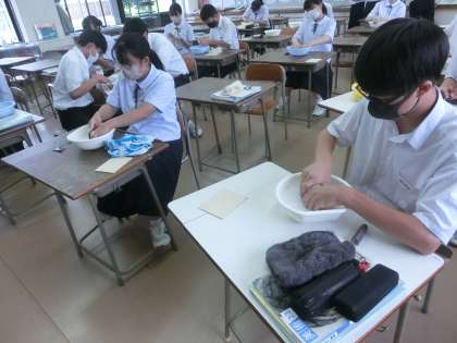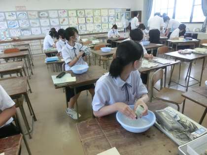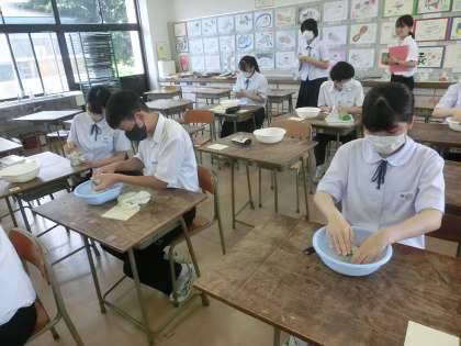 美術 滑石(かっせき)という石をやすりでけずり、抽象的イメージの作品を仕上げています。