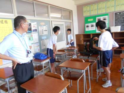 卓球部です。 熱中症事故予防のため、活動後、エアコンの効いた教室で体を冷やしてから下校しています。