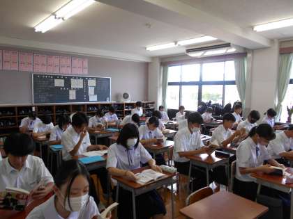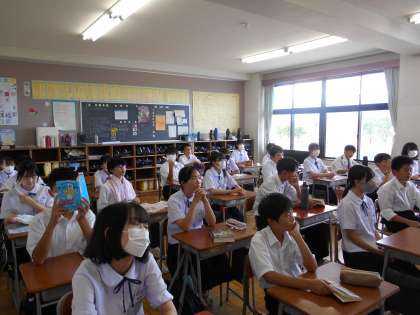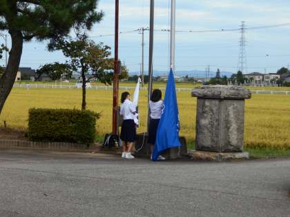 上:国旗・校旗を掲揚している様子です。 教室の様子 中:1A 下:2A