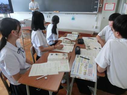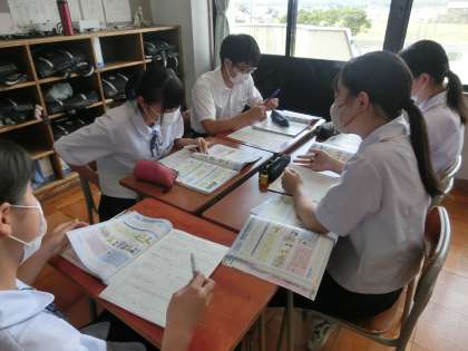 社会 個人の尊重と公共の福祉について、日本国憲法とからめながら、グループで話し合いをしています。