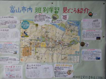 総合的な学習の時間では、「富山のよさを伝えよう」というテーマで追究活動をしています。10月の校外学習では、富山市内で班活動をします。実行委員が丁寧に見所紹介を作成してくれました。