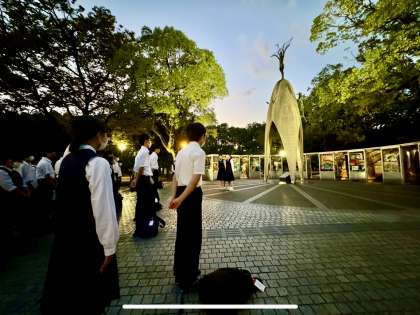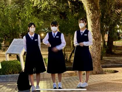 3年生 修学旅行 平和セレモニー(1) 公開日 2023/09/27 更新日 2023/09/27 3年生 「原爆の子の象」の前で平和セレモニーを行いました。 代表の生徒が平和宣言を表明し、祈りを込めた折り鶴を奉納するとともに、全員で黙祷を捧げました。