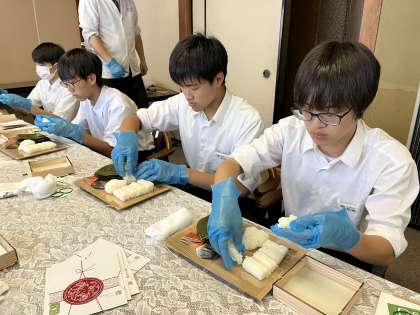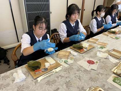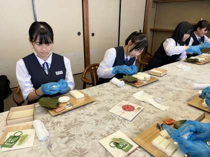 3年生 修学旅行 柿の葉寿司作り体験 公開日 2023/09/29 更新日 2023/09/29 3年生 柿の葉寿司職人がたくさんいました。 持ち帰るお寿司は明日が食べごろだそうです。 ご家族でお召し上がりください。