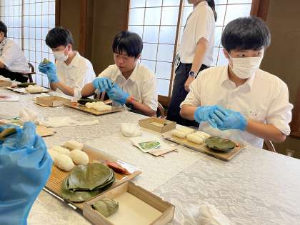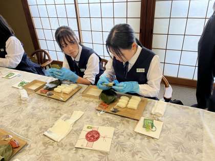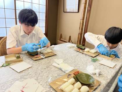 3年生 修学旅行 柿の葉寿司作り体験 公開日 2023/09/29 更新日 2023/09/29 3年生 「海の恵みの魚」と「地の恵みの米」を「山の恵みの柿の葉」で「優しさ」とともに包みます。先人たちの知恵が詰まった素敵な食べ物です。
