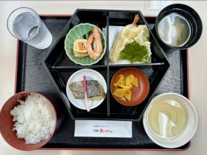 3年生 修学旅行 昼食(1) 公開日 2023/09/29 更新日 2023/09/29 3年生 A組のお昼は、和食御膳です。ごはん、天ぷら(海老、南瓜、ししとう、大葉)、炊合せ(有頭海老、にしん昆布巻、ふき、味付あげ巻)、ごはん、味噌汁、漬物、でした!美味しかったです。