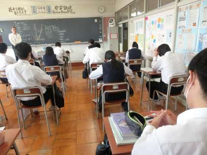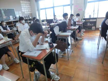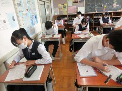 数学 二次関数と一次関数が交わるグラフの問題を解きました。入試に出題されやすいため、真剣に話を聞いていました。