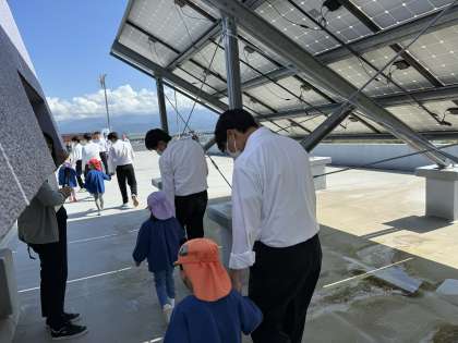 上条保育所と合同で、地震発生と大津波警報の発令を想定した避難訓練を行いました。グラウンドに避難した後、屋上に避難しました。