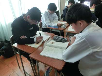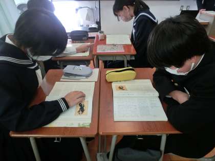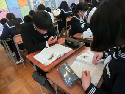 国語 平家物語を読んでいます。ペアで古文と現代語訳を交互に読み進めて、理解を深めています。