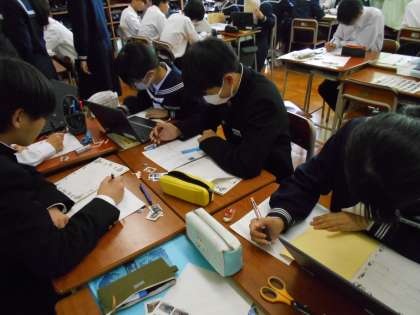 先週行ってきた宿泊学習について、まとめレポートを書いています。生徒たちは思い出を話しながらレポートを作成していました。完成が楽しみです。