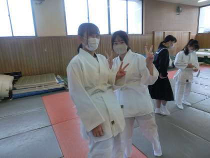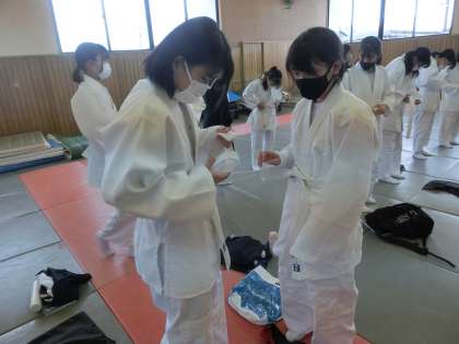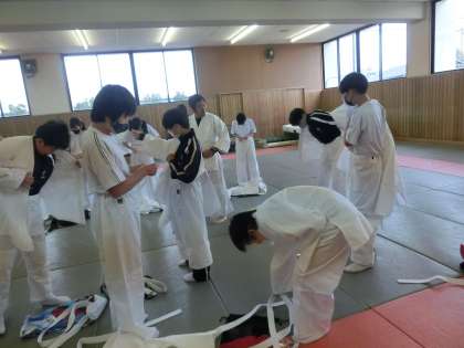 体育 柔道の学習が始まりました。今日は柔道着を着る練習をしました。帯の結び方が難しいのですが、友達と協力しながら上手に着ることができました。