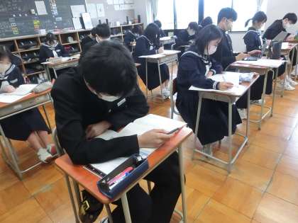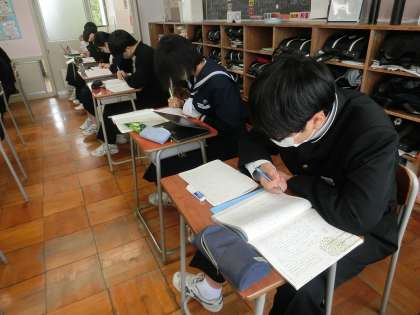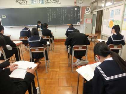 国語 黒板に書かれた課題作文に取り組んでいます。
